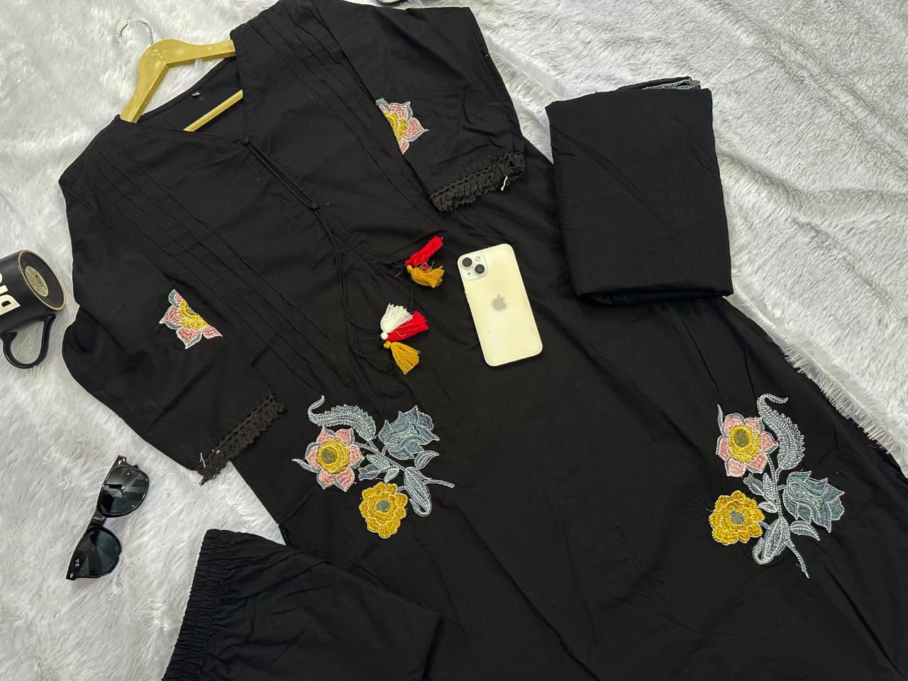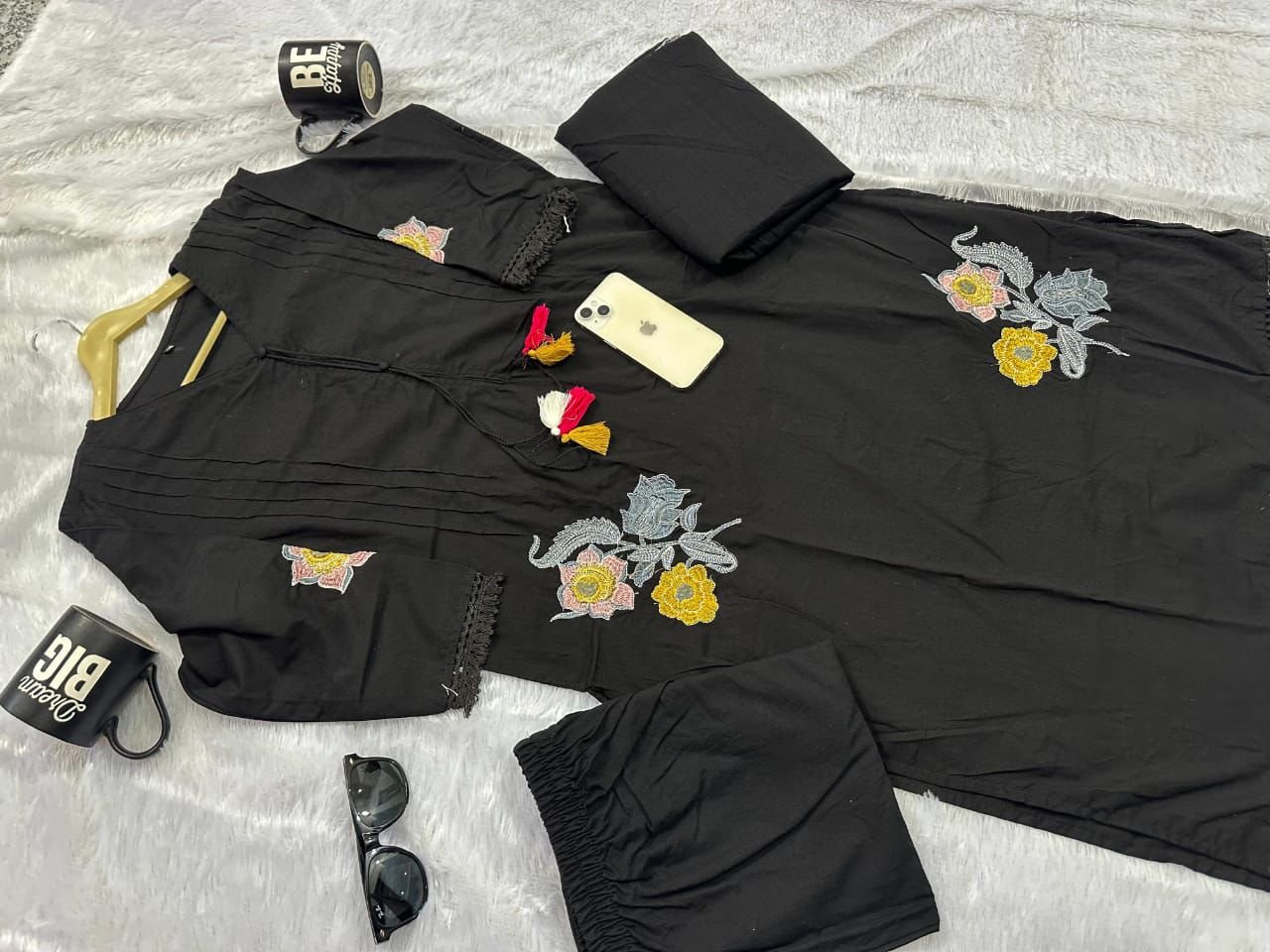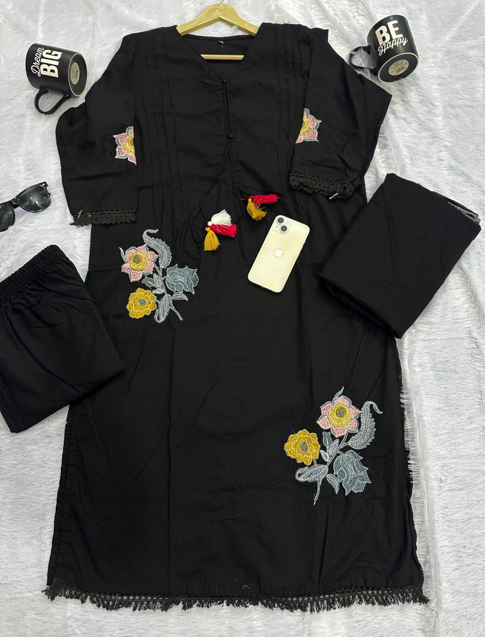 Black Embroidered Cotton Kurti Palazzo Dupatta Set