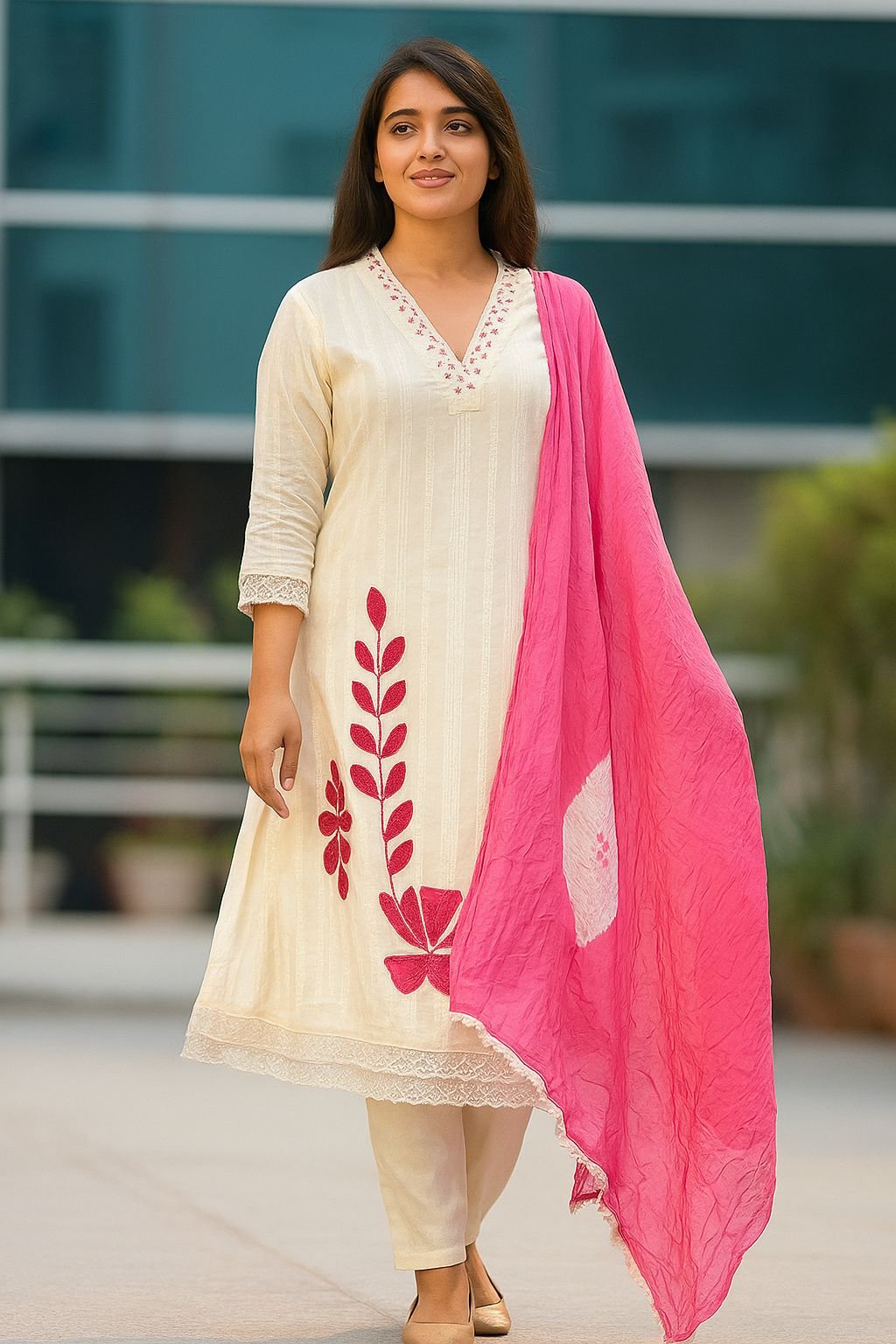 Net Lace Detailing on Kurti, Pant & Dupatta