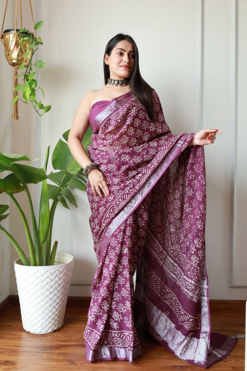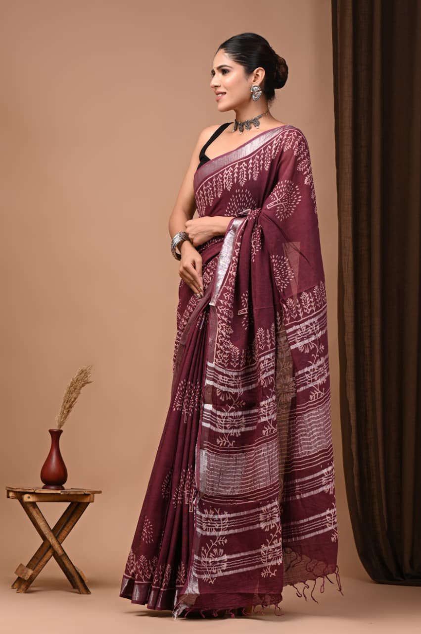 Hand Block Printed Linen Saree with Blouse