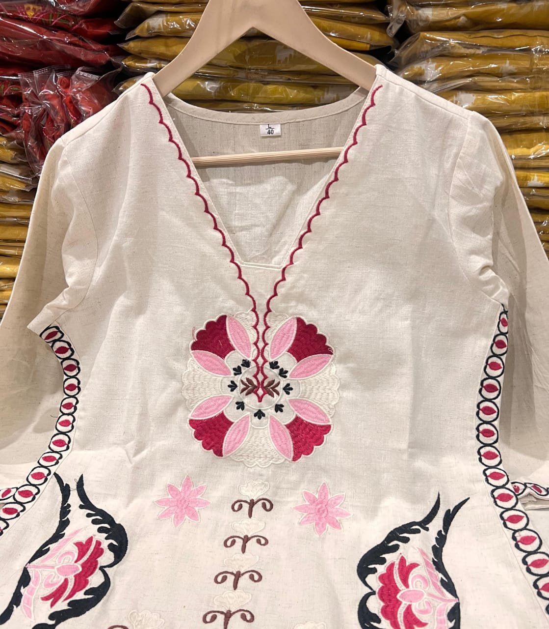 • Festive co-ord set with vibrant thread embroidery